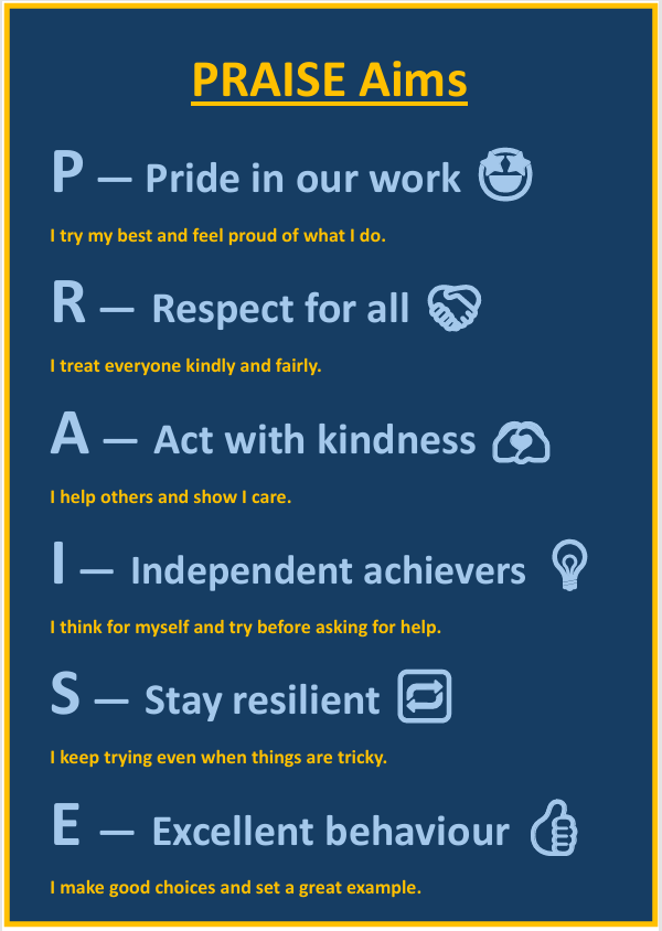 Pupils in Years 3–6 who consistently demonstrate our PRAISE aims may be selected as PRAISE pupils.
