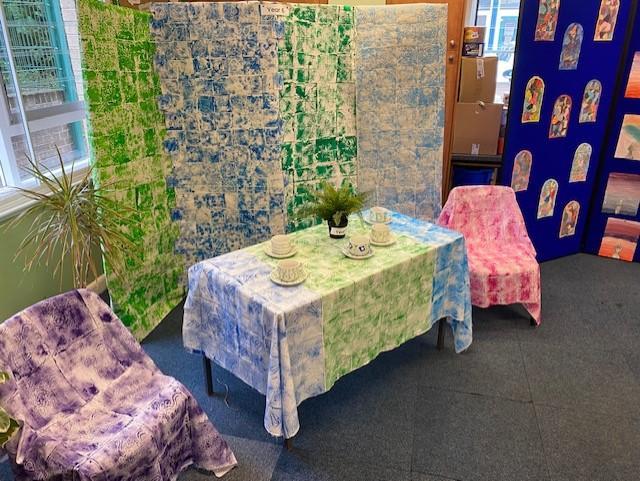 The Year 6 children created a William Morris inspired art installation piece. They used the technique of printing to create a tablecloth, chair covers and wallpaper!