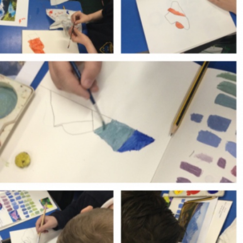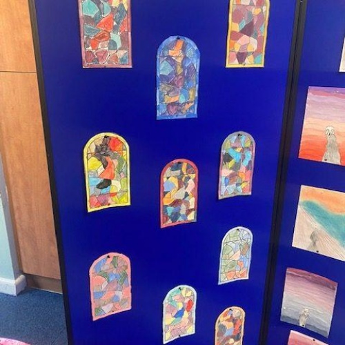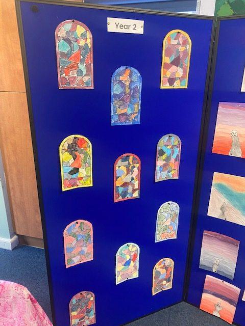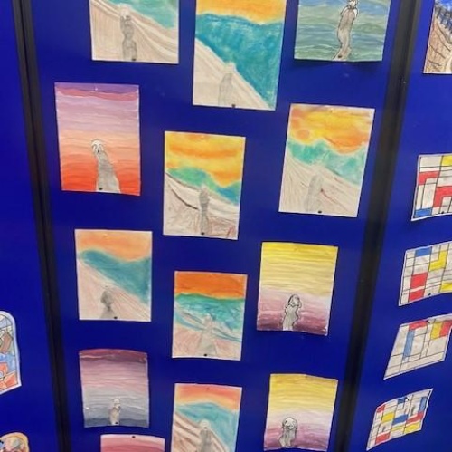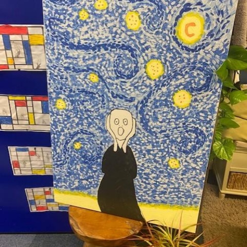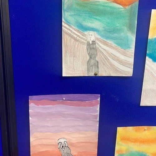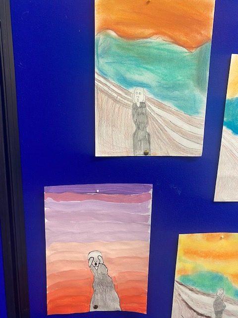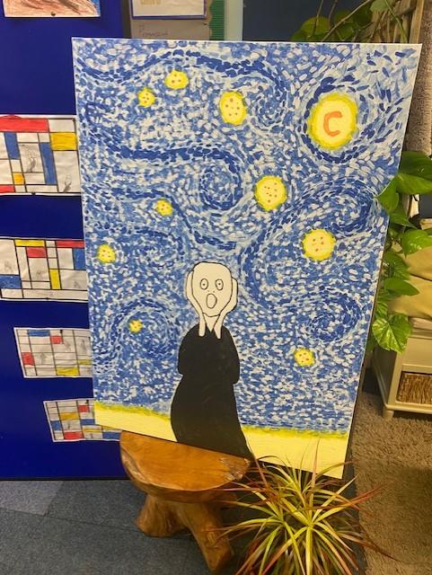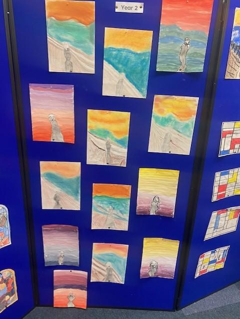 During our whole school Art Week, the children in Year 1 and 2 explored the artwork of Edvard Munch and Vincent Van Gough. They created their own versions of ‘The Scream’ and also stained glass windows using pastels. The children worked collaboratively to create an art canvas inspired by both Munch and Van Gough.