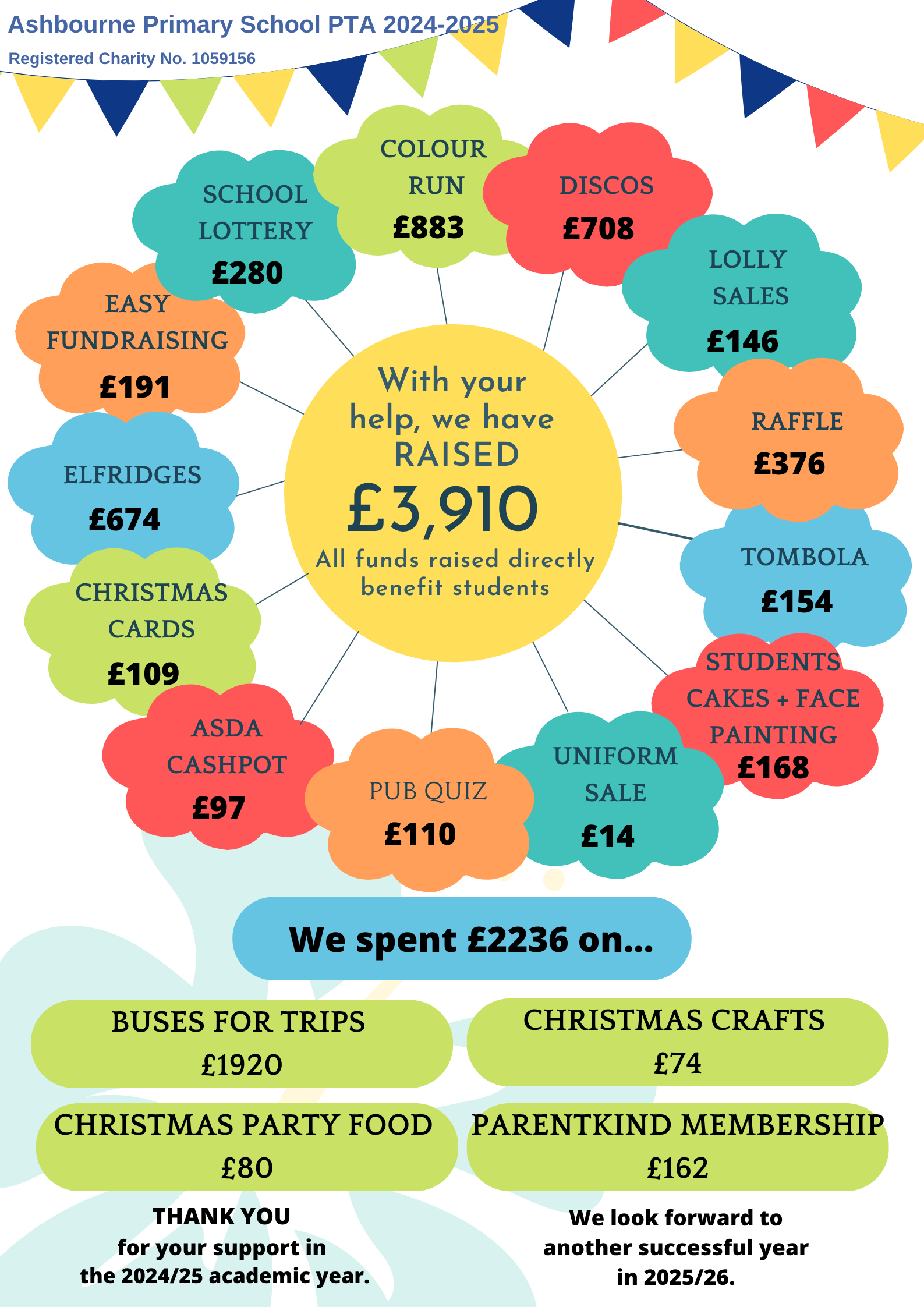 Ashbourne Primary School's PTA are dedicated to providing a well-rounded education for all children that attend the school and fund both academic and wider opportunities to enrich the children’s experiences. We are a close team who work well together to raise money for the children at Ashbourne Primary. We raise money in various ways through discos, raffles, Elfridges, summer fairs, Bags2School, preloved uniform sales, cake/ice lolly/donut sales as well as sponsored events such as our Easter bunny bounce, summer colour run and more!